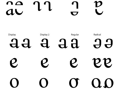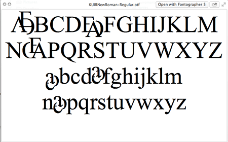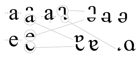 Como a ideia era criar uma tipografia que pudesse ser usada nos experimentos textuais do laboratório, partiu-se para a interferência nos caracteres a partir dos arquivos digitais das fontes bases (Arial e Times New Roman). Os glifos das vogais foram vetorizados e recortados na mesma lógica do estêncil, e em seguida encaixados de diferentes maneiras. Na variante que gerou a família Cuir Roman Times, os glifos “a”, “e” são fragmentados e suas partes invertiras e reorganizadas para formar as vogais degeneradas. Na identificação dos caracteres no mapeamento da tipografia, os glifos “e”, “a” foram apontados como caracteres que pudessem ser lidos como os originais “e”, “a”, “o”.