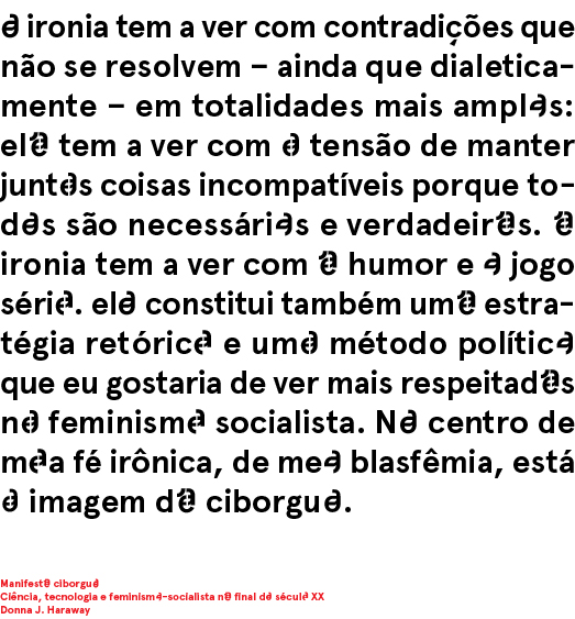 A questão do gênero na língua portuguesa – e línguas latinas em geral –, seja na predominância do masculino no plural ou em sua presença em todas as coisas – substantivos –, apresentou-se, de início, como uma questão insuperável. Experimentando com esse problema, Fabio Morais reescreveu o Manifesto ciborgue de Danna Haraway em duas versões: uma com palavras masculinas e outra com femininas. A questão do limite entre o que se diz e como se diz foi uma discussão importante: é possível uma publicação feminista ter uma linguagem patriarcal como base? Somo todos feministas ou todas feministas? A necessidade de fala é maior do que a subversão da forma? Qual a medida entre essas duas coisas?
